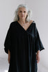 Maude šaty jsou oversized střihu, véčkový výstřih, nabírání do tvaru, balónový rukáv do gumy, kapsy ve švu, délka lehce nad kotníky, comfy silueta
