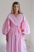 Wrap puff dress jsou zavinovací, přestrižené v pase, uzavřenější výstřih, velkoryse nabírané v pase, balónový rukáv velkoryse nabíraný kol do kola, rukáv do předšité gumy, kapsy ve švu, délka delší midi.